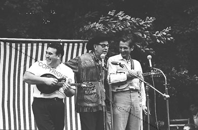 Jimmy Driftwood (center) an Arkansas folklorist and performer who wrote the hit song "Battle of New Orleans," cracks up Bobby Osborne (left) and Mike Seeger at a daytime workshop.